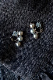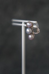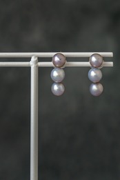 グレー系の淡水パール(約6ミリ)を縦に3つ並べたデザインのイヤリングはピアスのように見えます。