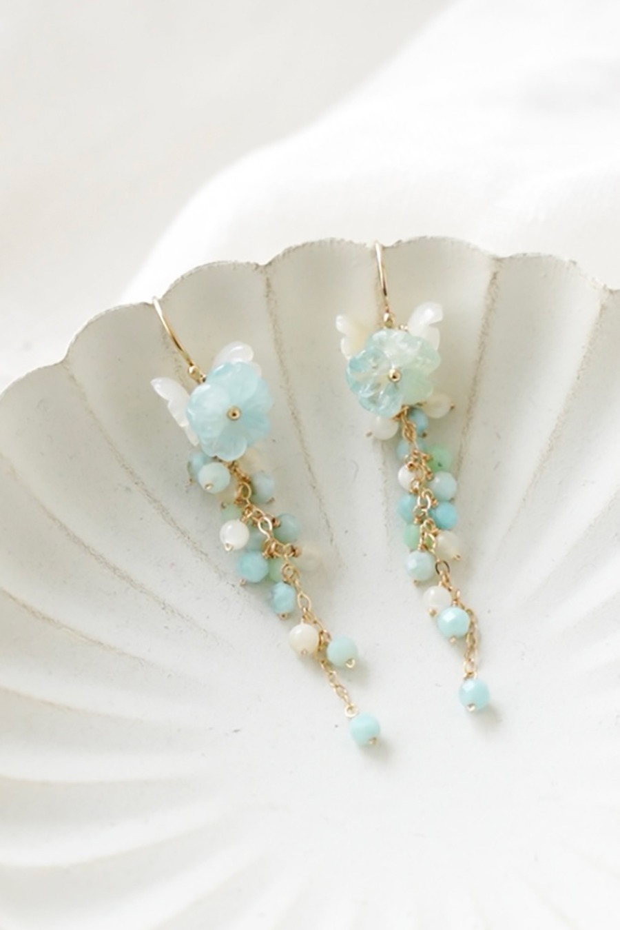 主役は可愛い形のフラワーカットですが、縦に伸びるラインと涼やかな色合いで、甘すぎない印象のピアスです。